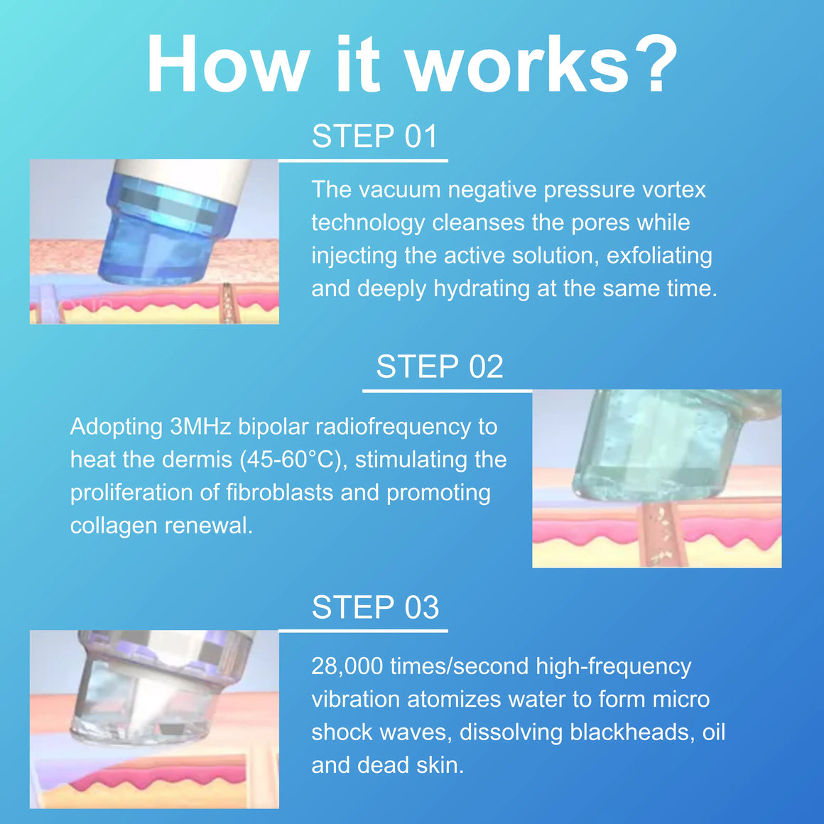 Limpieza profunda e hidratación: La máquina elimina el aceite, la suciedad y las células muertas de la superficie de la piel, así como los poros a través de tratamientos no invasivos y flujo de agua a alta presión, limpiando eficazmente los poros y reduciendo la formación de puntos negros y acné.