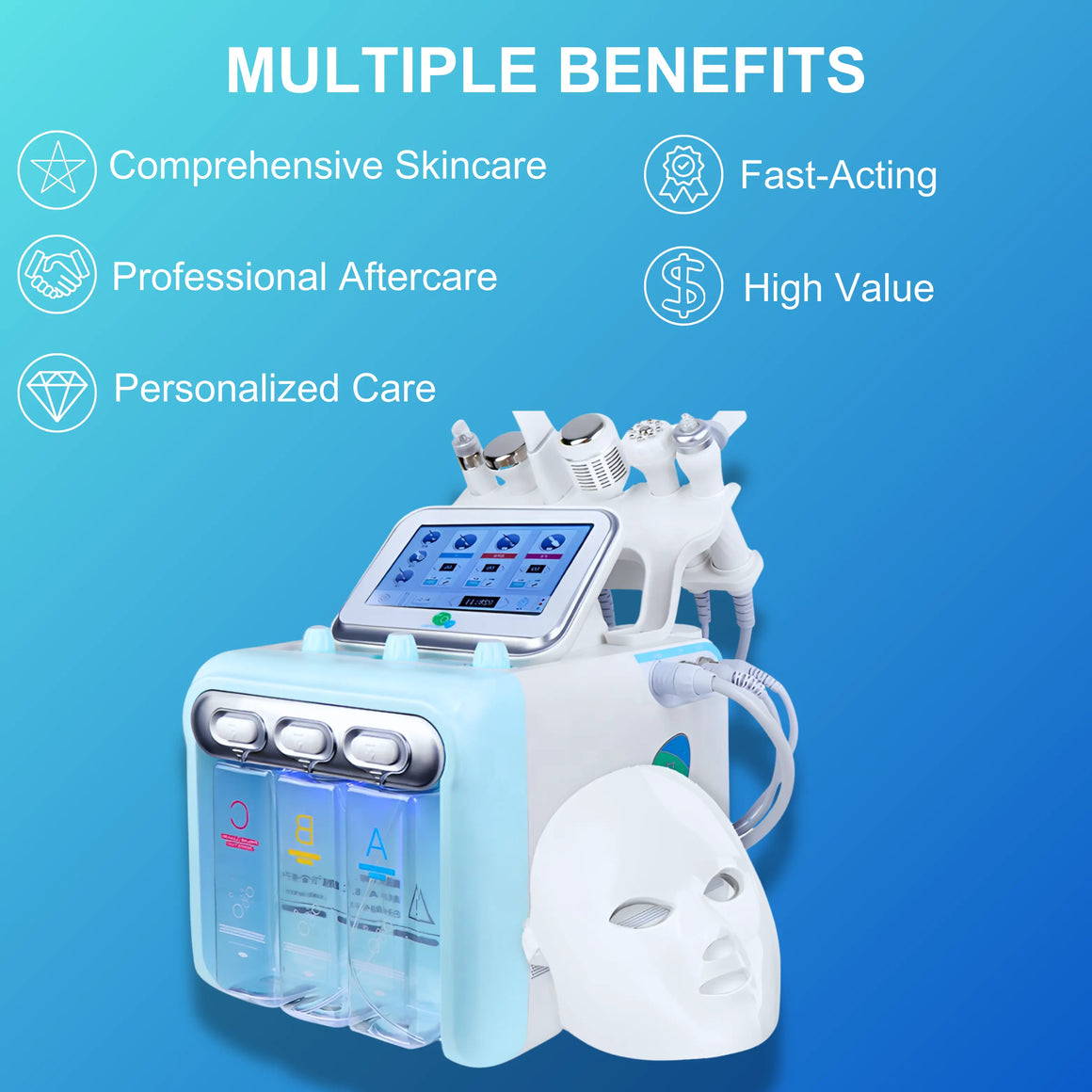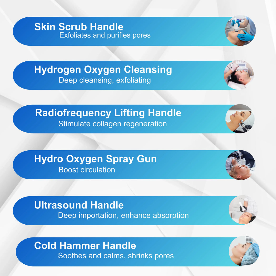 Multifuncionalidad: Una colección de varias tecnologías de cuidado de la piel, como inyección hidrafacial, spray de hidroxilo, importación y exportación, radiofrecuencia para tensado de la piel, crioterapia, cuchillo ultrasónico, etc., que pueden satisfacer las necesidades de diferentes problemas de la piel.