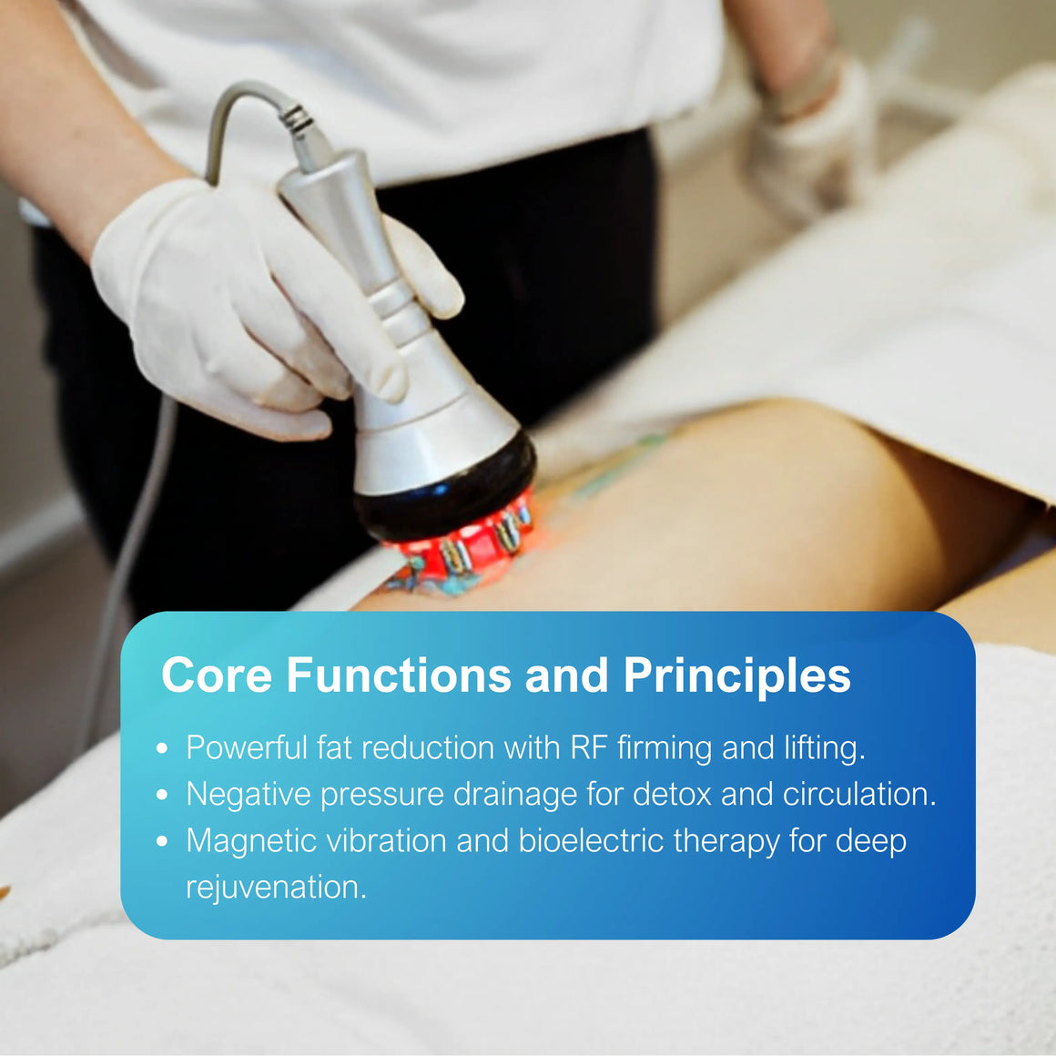 4. Cabezal de liposucción RF de presión negativa 3D: Al incorporar tecnología RF avanzada, este cabezal apunta al tejido adiposo profundamente arraigado, generando calor a través de la fricción y promoviendo la eliminación de grasa y toxinas a través de procesos naturales del cuerpo. También estimula la circulación sanguínea y ayuda a reducir la celulitis, mejorando el estado general de la piel y los tejidos.
