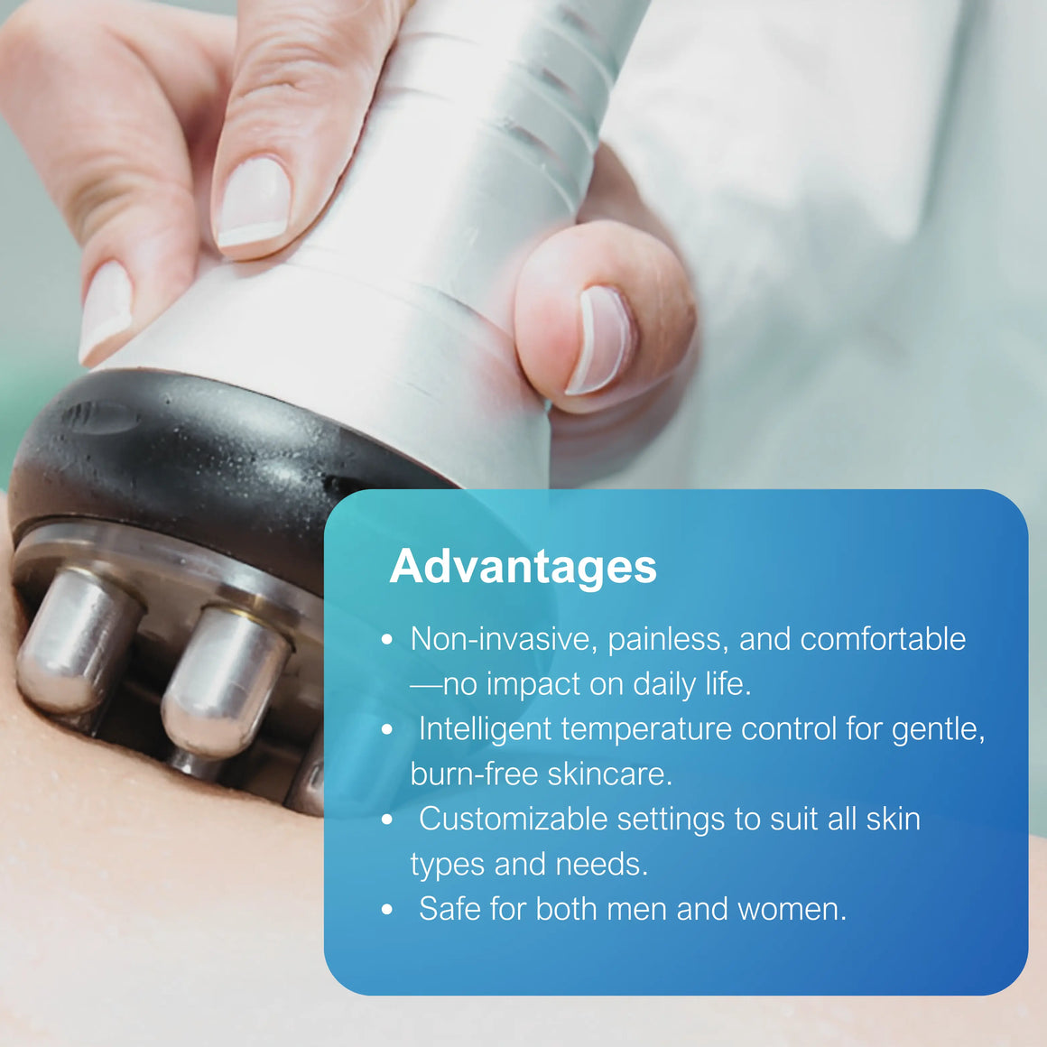 2. Cavitación con quema de grasa por ultrasonido de 80K: un fuerte cabezal de onda de sonido colectivo emite una frecuencia de 80.000 Hz para crear bolsas de aire al vacío tanto dentro como fuera de las células grasas, lo que hace que implosionen y conviertan los triglicéridos en glicerol y ácidos grasos libres. Posteriormente, las ondas de RF de 1MHz ayudan a expulsar estos subproductos a través de los procesos naturales del cuerpo.