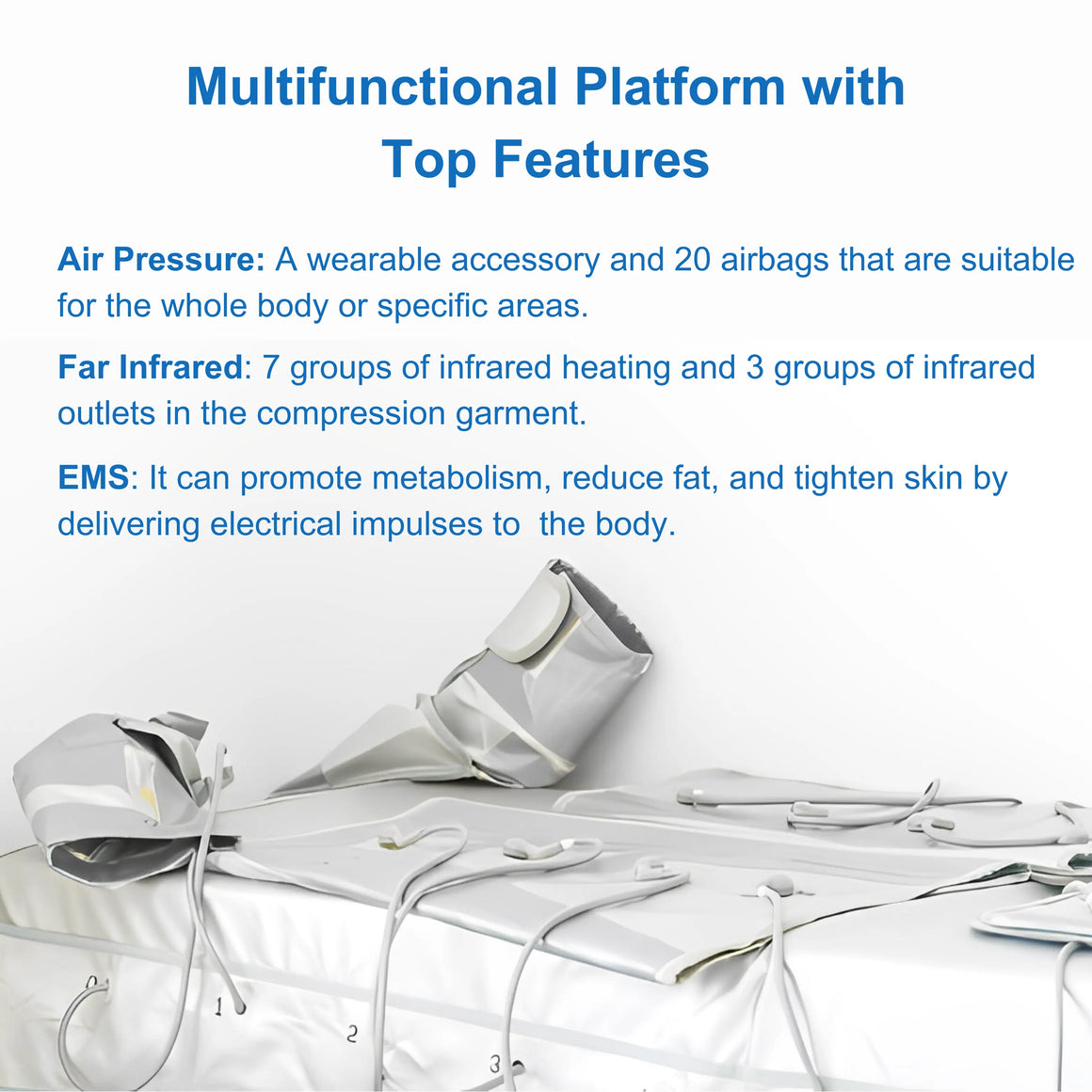 2. Funcionalidad versátil: Las funciones de presión de aire y calefacción por infrarrojos pueden operar de forma independiente en diferentes partes del cuerpo. El sistema incluye 20 grupos de cámaras de aire, 8 salidas de aire y 7 grupos de calefacción por infrarrojos con 3 salidas de infrarrojos.