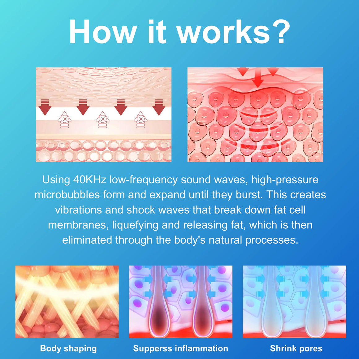 Réduction ciblée des graisses : Le système de cavitation ultrasonique 40K cible les dépôts de graisse profonds pour les décomposer, offrant ainsi un amincissement et un remodelage corporel efficaces.