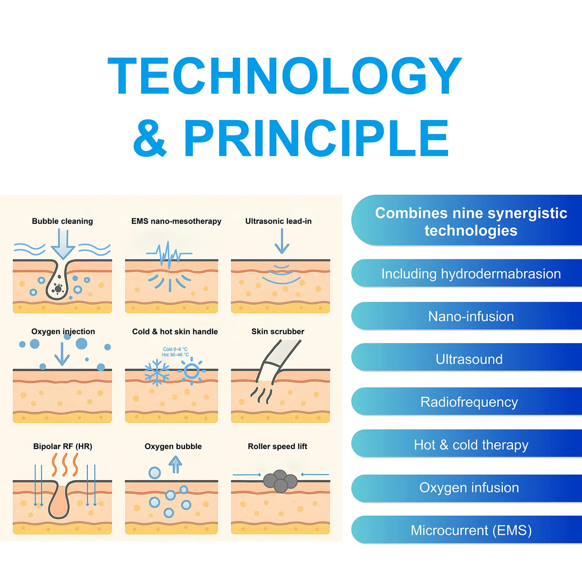 • All-in-One Performance (9 Functions): Bubble cleansing, EMS nano-infusion, ultrasonic, oxygen care, hot/cold therapy, skin scrubber, and RF—one console, full menu.