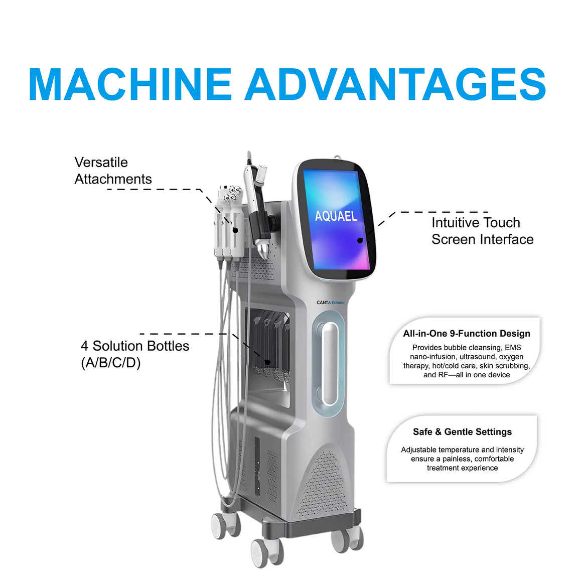 Our machine combines nine synergistic modalities rooted in the power of hydro-dermabrasion, nano-infusion, ultrasound, radio frequency, cold/hot therapy, oxygen delivery, and microcurrent (EMS):