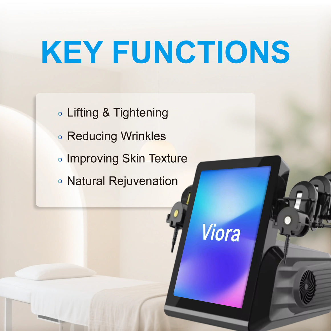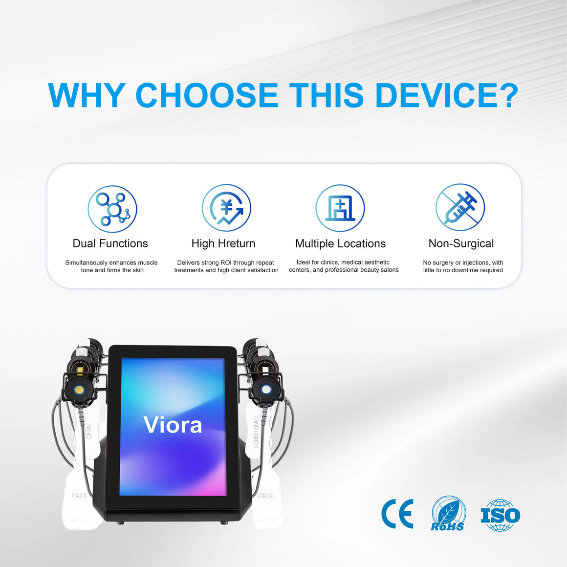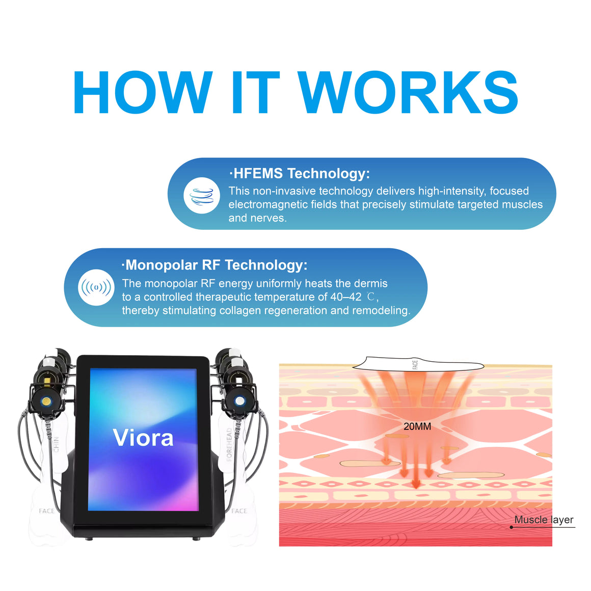 Viora Face Lift Machine is a professional-grade anti-aging device that integrates High-Frequency Electromagnetic Stimulation (HFEMS) and Monopolar Radiofrequency (RF) technologies. It’s especially designed for beauty salons, medical aesthetic clinics, and other high-end skincare centers. By stimulating deep muscle stimulation and heating dermal, this machine targets both muscle sagging and skin aging to achieve a natural, long-lasting lifting and firming effect.