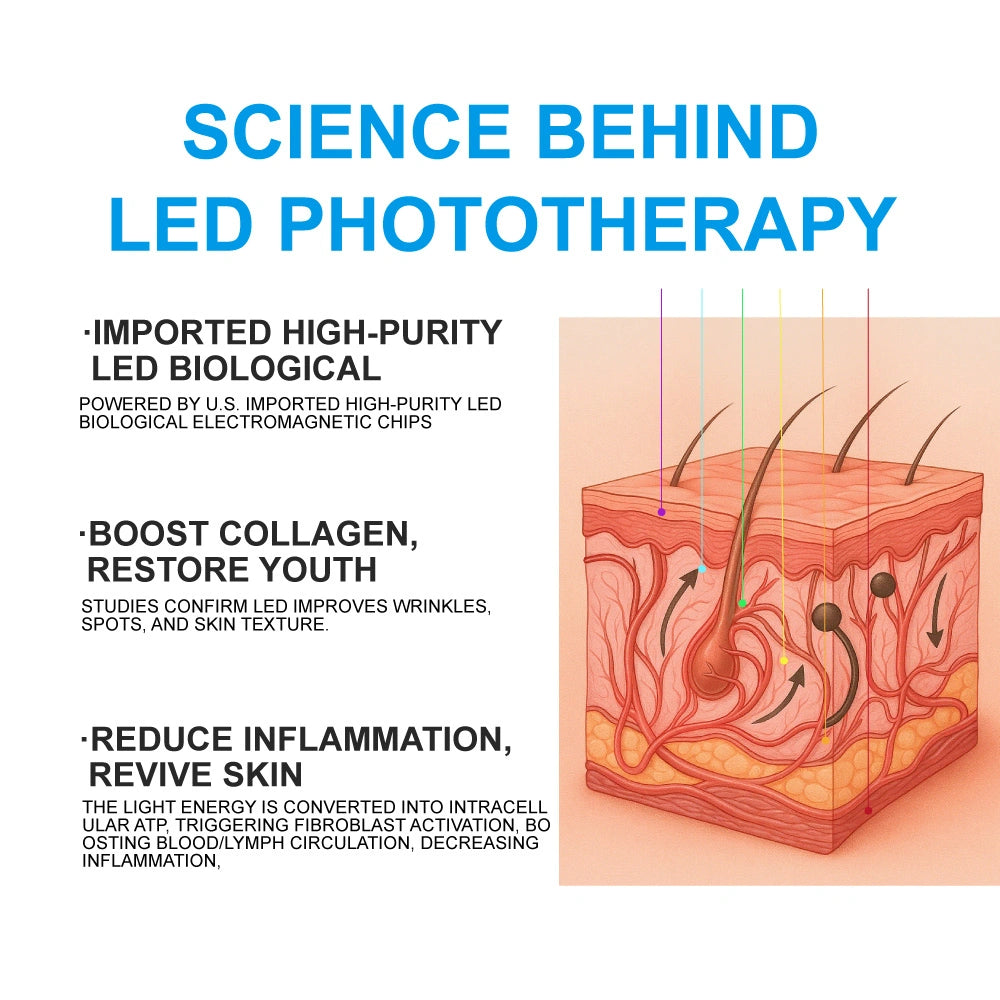 Powered by U.S. imported high-purity LED biological electromagnetic chips, this PDT (Photodynamic Therapy) system emits precisely calibrated wavelengths that penetrate different depths of the skin (0.01–10mm). Once absorbed by target cells, the light energy is converted into intracellular ATP, triggering fibroblast activation, boosting blood/lymph circulation, decreasing inflammation, accelerating cell metabolism and prompting collagen & elastin production — resulting in healthier, stronger, more youthful skin tissue from the inside out.