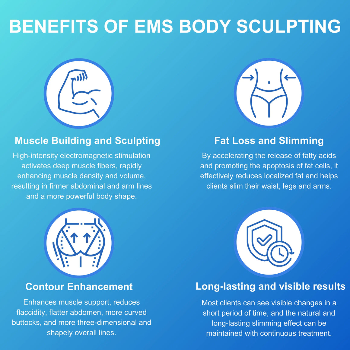 1. Wzmocnienie mięśni: Technologia wysokoenergetycznej skupionej elektromagnetycznej wywołuje skurcze mięśni, które przewyższają intensywność tradycyjnych ćwiczeń, skutecznie wzmacniając siłę i objętość mięśni.