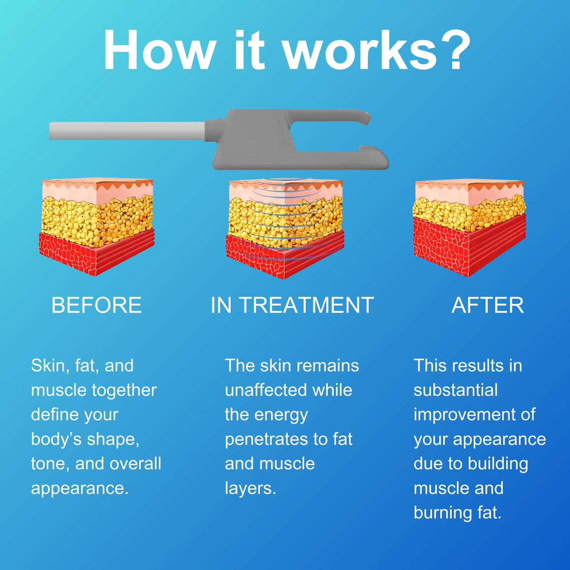 Technologia HIEMT (High Energy Focused Electromagnetic Wave) jest używana do skurczów mięśni, zwiększenia siły mięśni i kształtowania dobrze zdefiniowanych mięśni. Skurcz mięśni może skutecznie promować wzrost włókien mięśniowych w obszarze leczenia, osiągając tym samym efekt wzmacniania mięśni i zwiększania masy mięśniowej, redukcji tłuszczu i wyszczuplania ciała. Radiofrekwencja RF może podgrzewać obszar leczenia, pozwalając tłuszczowi szybko osiągnąć temperaturę leczenia, osiągając podwójne efekty ujędrniania i rozpuszczania tłuszczu.