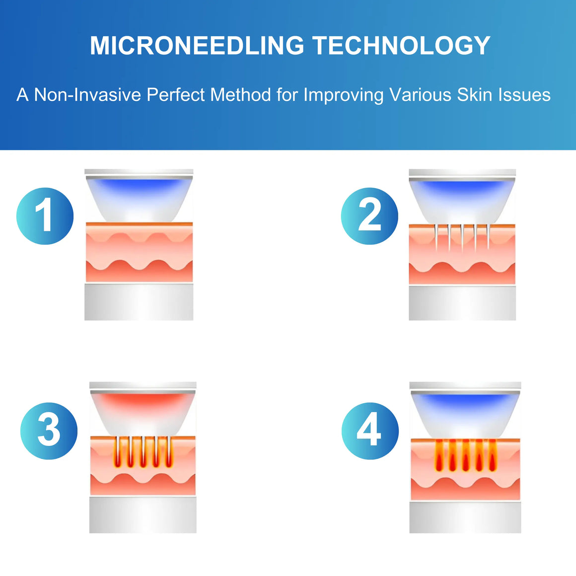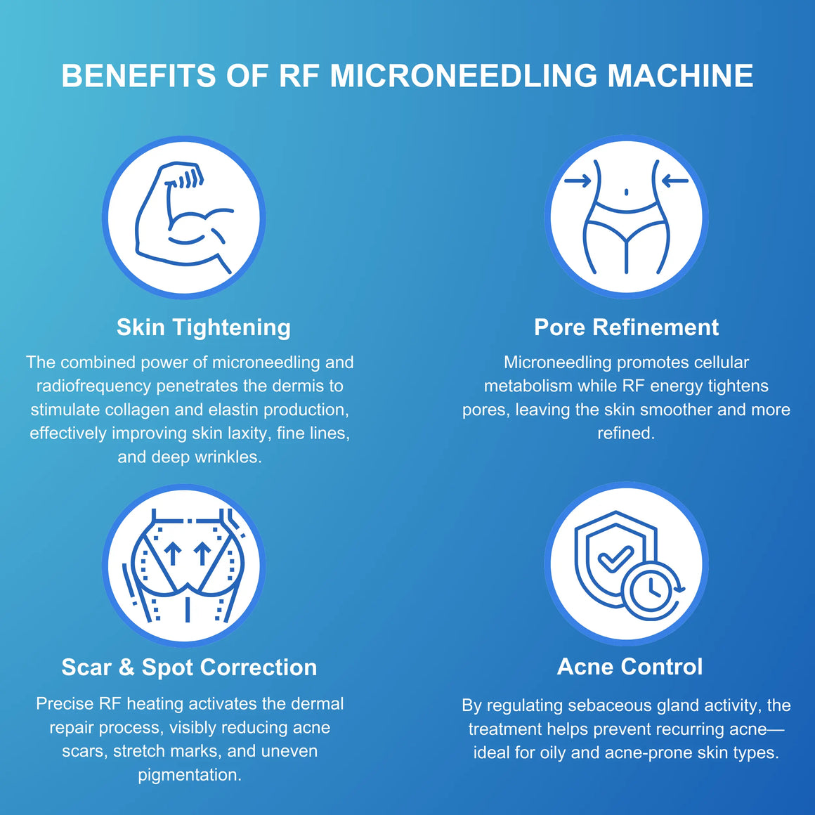 Mikronakłuwanie RF: Poprzez drobne urazy, mikronakłuwanie stymuluje naturalny proces gojenia skóry, w tym produkcję nowych włókien kolagenowych i elastynowych. Jednocześnie energia RF podgrzewa skórę, dostarczając energię radiową do warstwy skórnej. Powoduje to, że skóra się napina i ujędrnia, stymulując produkcję kolagenu i elastyny.