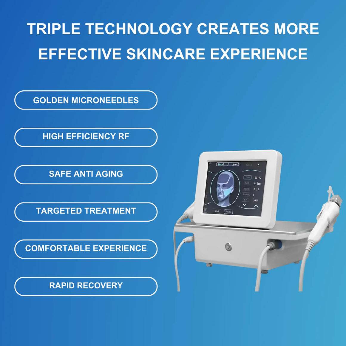 Główna technologia maszyny do mikronakłuwania RF to mikronakłuwanie, które jest bezpiecznym i skutecznym zabiegiem dla szerokiej gamy typów skóry. Znane również jako terapia indukcji kolagenu, mikronakłuwanie aktywuje naturalny proces naprawczy organizmu poprzez powodowanie mikrouszkodzeń skóry, stymulując skórę do naturalnej produkcji większej ilości kolagenu i elastyny, co skutkuje bardziej promienną, jędrniejszą skórą.