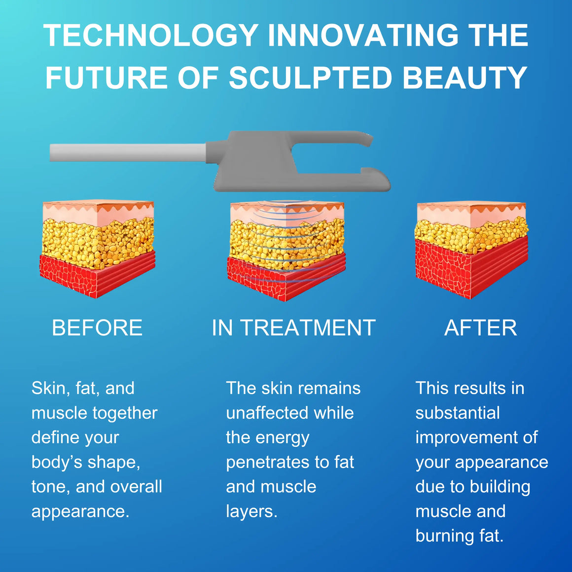The combination of advanced HIEMT plus RF technology within each handle sends high-frequency and adjustable power to the muscle layer under the deep skin. It targets fat cells and muscle without harming other tissues and organs, ensuring maximum comfort and safety during intense muscle stimulation.