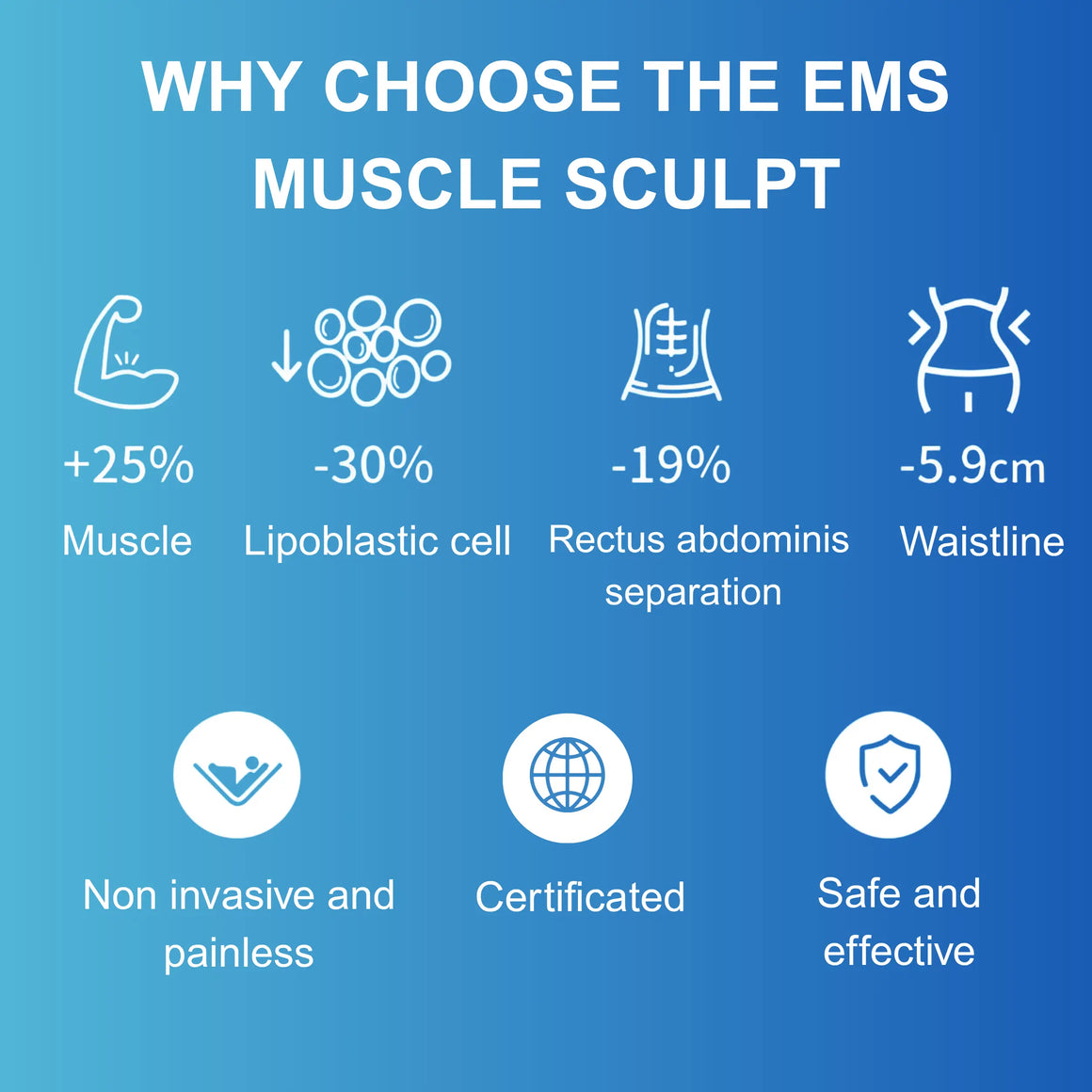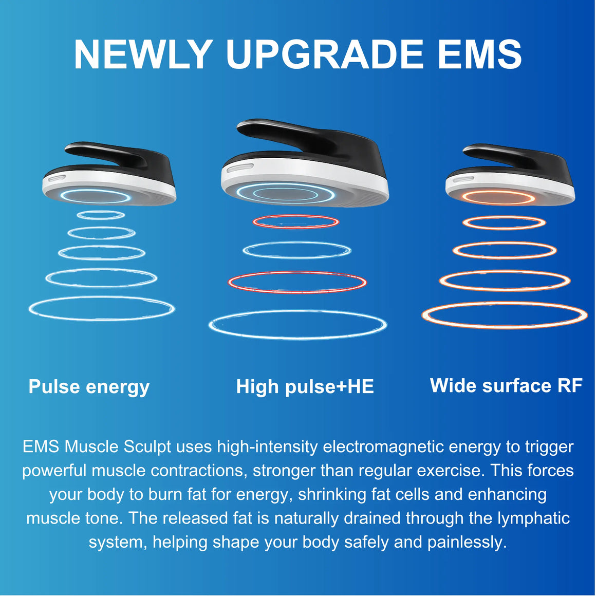 EMS Muscle Sculpt is powered by the advanced Synchrode HE technology, which combines High-Intensity Focused Electromagnetic (HIEMT) energy with synchronized Radio Frequency (RF). HIEMT induces supramaximal muscle contractions—far beyond what is possible through voluntary exercise—stimulating deep muscle remodeling. At the same time, RF energy generates controlled thermal effects in the subcutaneous fat layer, promoting fat cell breakdown and enhancing collagen regeneration. This synergistic approach effectively tones muscles, reduces fat, tightens skin, and boosts metabolic activity, all in one treatment.
